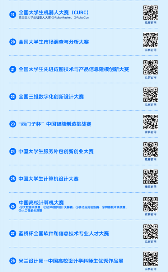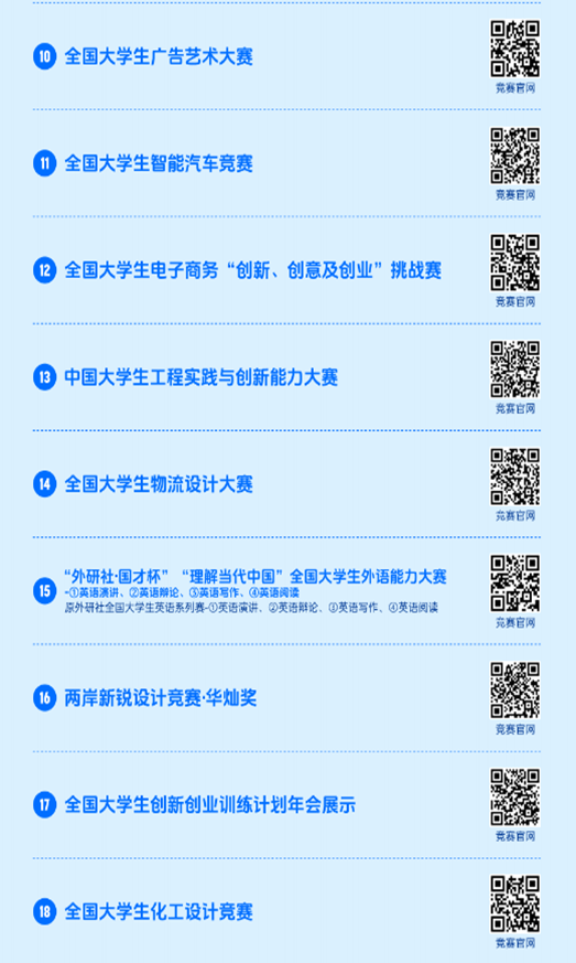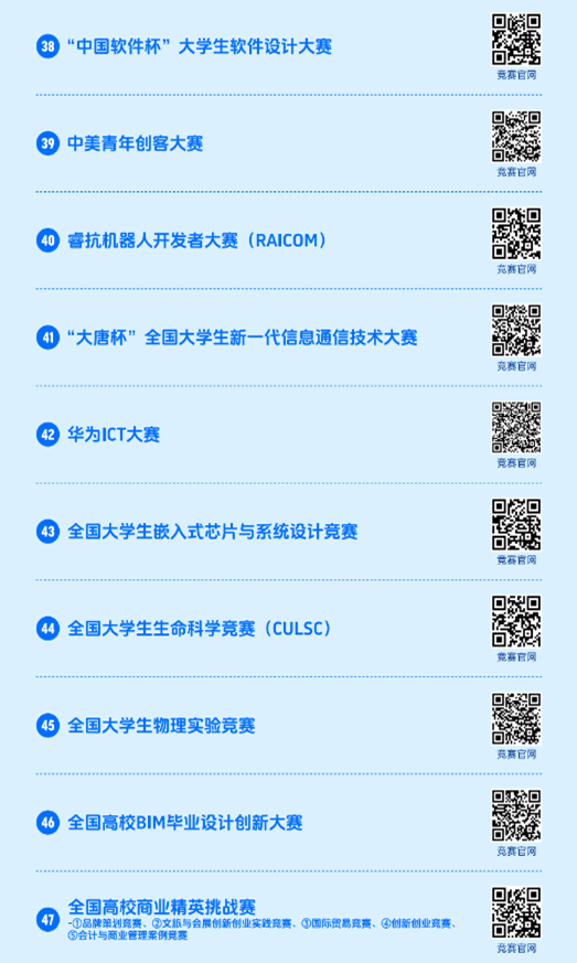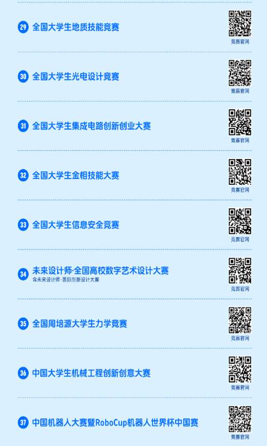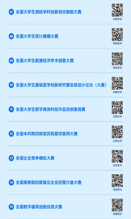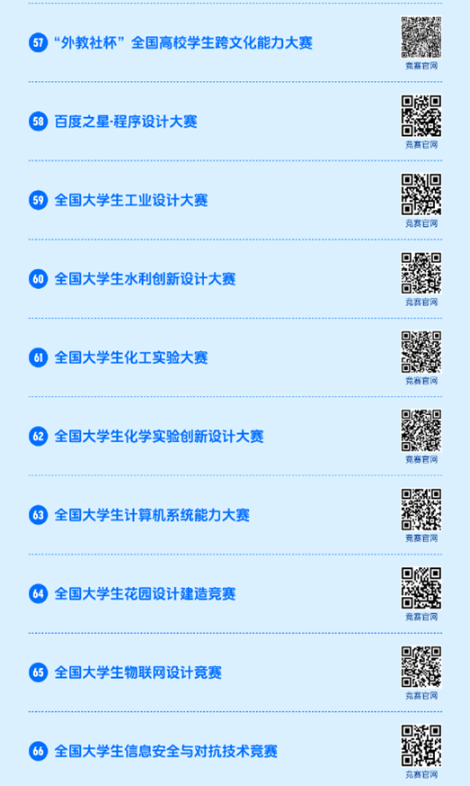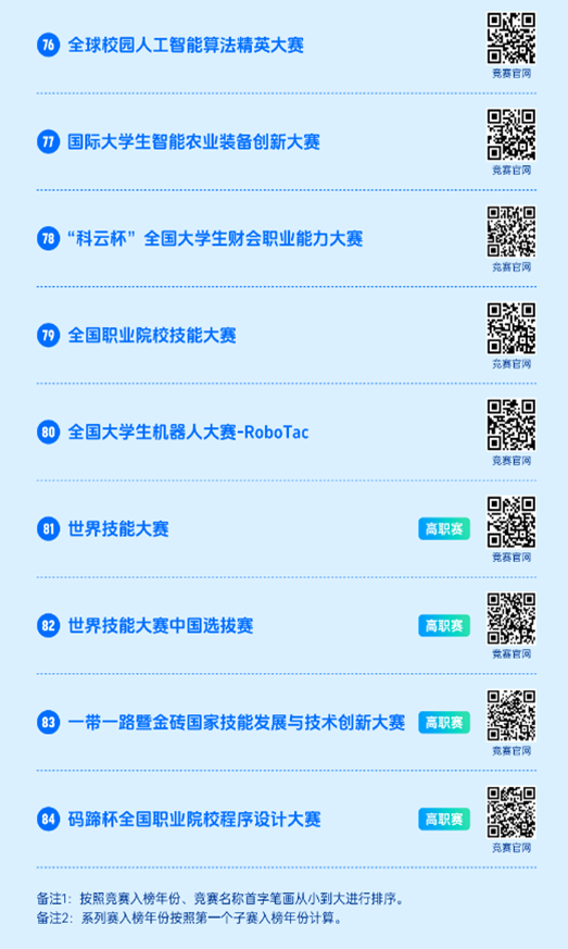 2023全国普通高校大学生竞赛分析报告》同步在中国高等教育学会官网(https://www.cahe.edu.cn)中,共计竞赛目录84项,名单如下。