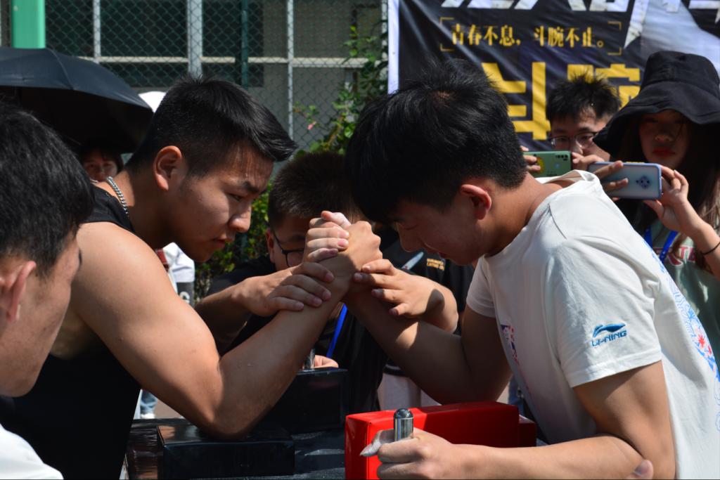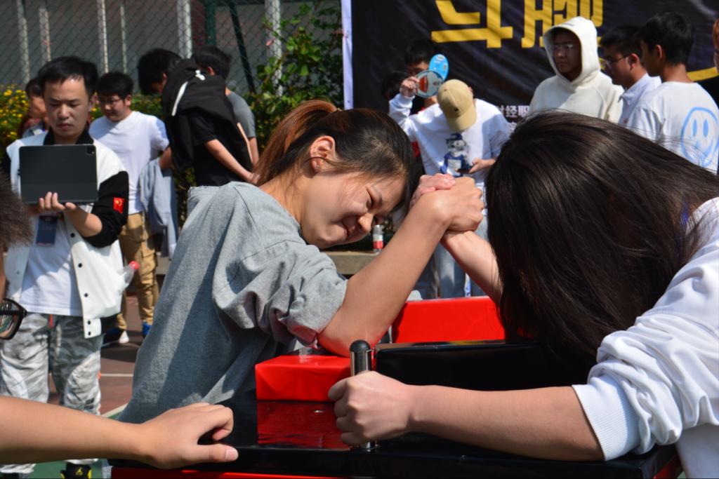 比赛分为男、女组,并按体重分为几个不同的小组,以保证公平竞争。男子组选出的代表也都是各班的“肌肉型男”,他们在赛场上分毫不让,在阳光下挥洒汗水,在坚持中展现力量,为班级和个人赢得荣誉,向同学们展示出朝气蓬勃的一面。女子组的比赛也毫不逊色,气势相当,竞争十分激烈。女生与女生之间的较量也是非常精彩,双方互相僵持,面红耳赤,赛场上拼尽全力,不到最后不愿认输。