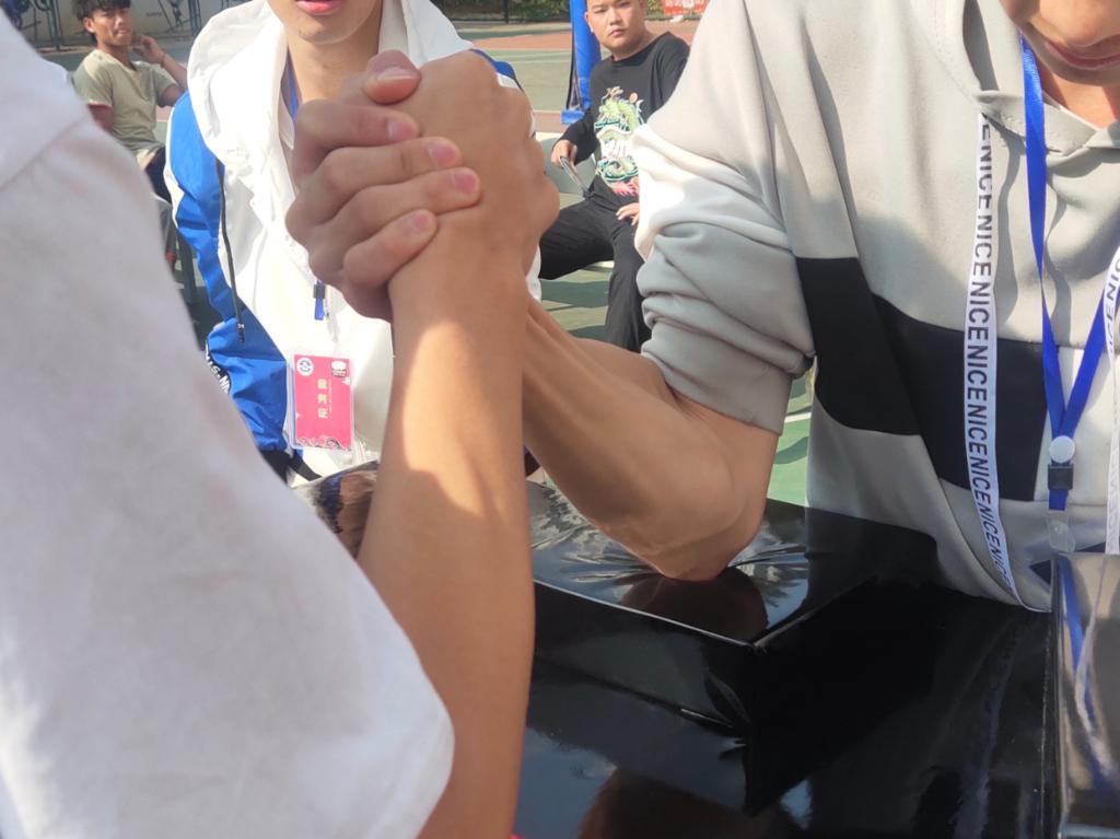 比赛活动开始后,经济学院老师们现场见证同学们的精彩表现,为参赛的选手们加油鼓劲。比赛现场的选手们都积极奋战,心无旁骛,听从裁判的指挥,专心于比赛场上,热情洋溢。场外观战的同学们也心潮澎湃,高声为参赛同学呐喊加油,赛场上热火朝天,比赛有条不紊地进行着。扳手腕比赛,是一场力量与力量的竞技和较量,通过赛前培训让选手们知晓比赛规则,所有参赛选手统一使用右手进行比赛,赛制采取三局两胜制,每局赛时为一分钟。在比赛时,同学们也秉持“友谊第一,比赛第二”的理念,遵循体育精神,公平竞赛。