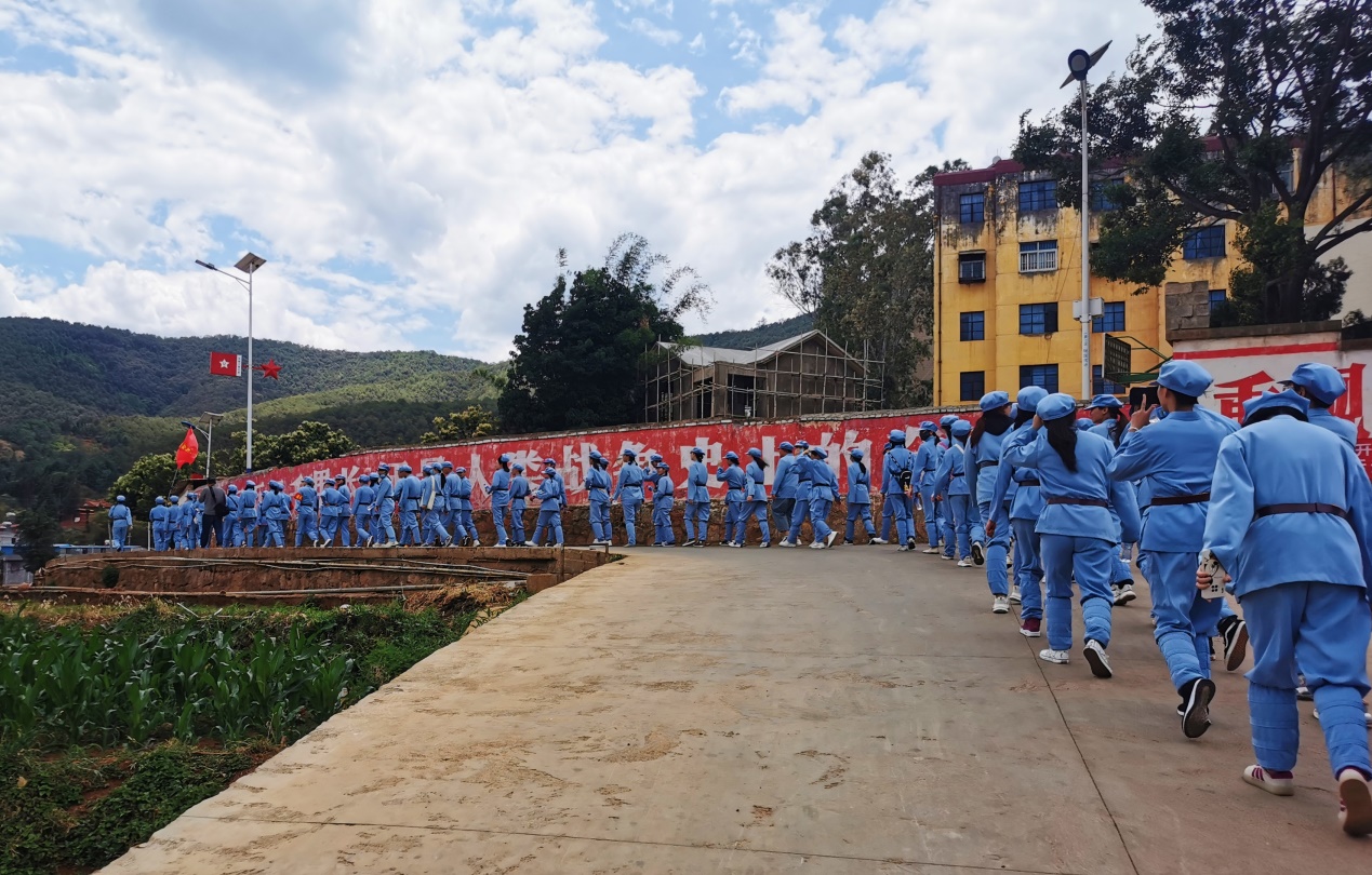 2021年5月21日8:00,参与活动的师生在国旗台集合,乘坐大巴前往柯渡纪念馆教学基地。在大巴行进过程中,师生一起进行晨读、唱红歌活动,毛主席的《七律.长征》响彻整个大巴车,抵达柯渡纪念馆后党员师生换上了红军装。