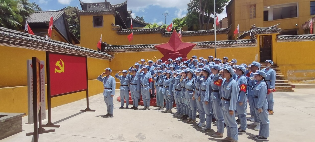 在中央红军总部驻地旧址大院内,由学校党委副书记仲新同志领誓,全体党员面对党旗,举起右手,重温入党誓词。
