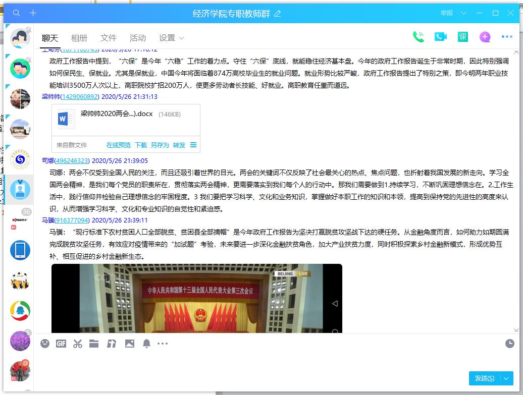 2020年“两会”正值疫情防控期间,我校学生实行封校管理,但这并没有阻止师生们关注“两会”,经济学院师生严格遵守疫情防控工作要求,通过多种渠道,密切关注“两会”动态,深刻学习领会“两会”精神。为了避免多人聚集,本次学习老师们通过QQ和微信群讨论的形式进行讨论,同学们以宿舍为单位进行分组讨论学习。