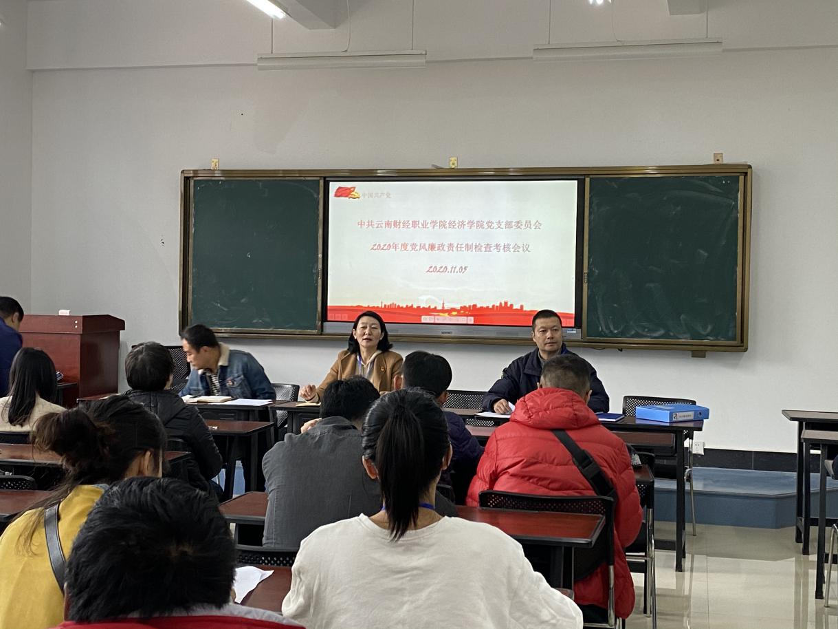 在经济学院党支部和所属部门自查、自评的基础上,2020年11月5日下午15:30,在第三教学楼601教室召开了经济学院党支部党风廉政建设责任制考核汇报会,向第三检查考核组进行支部及所属部门的党风廉政建设工作汇报。