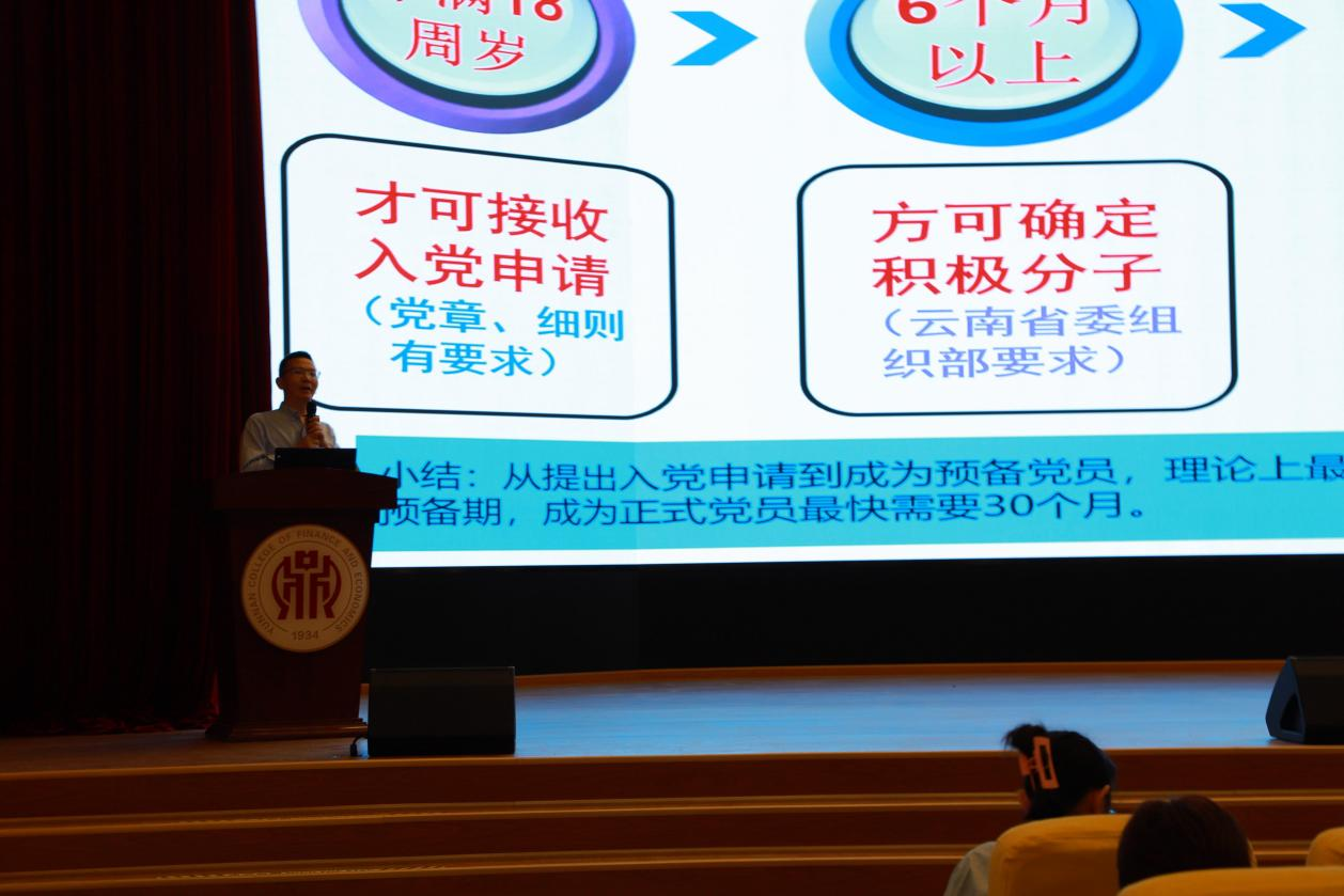 为引导新生筑牢理想信念根基,树立正确政治追求,扣好入党 “第一粒扣子”,2025 年 8 月 27 日,云南财经职业学院数字商学院举办新生入党知识专题讲座。党支部书记刘珍亿以 “明标准、正动机、知程序” 为核心,为新生们带来一堂兼具理论深度与实践指导意义的党课,助力新生开启对党的认知新旅程。