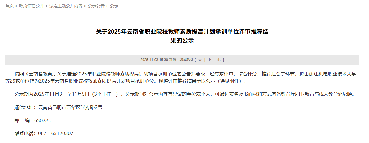 此次成功入选,既是对我校办学实力和综合服务能力的充分肯定,也为学校进一步深化教育教学改革、增强社会影响力提供了重要平台。学校将以此为契机,持续完善培训体系,强化组织实施,努力打造特色鲜明、实效突出的师资培训品牌,为云南省职业教育高质量发展作出新的更大贡献。