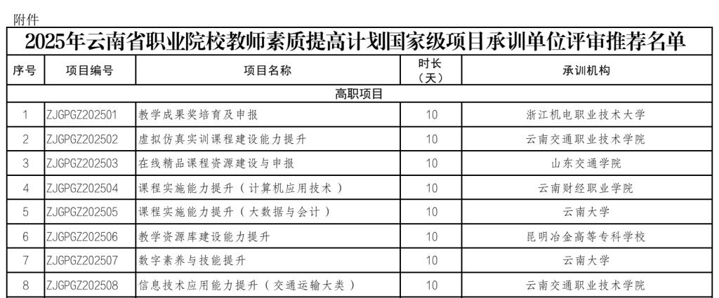 2025年,全省共规划实施9大类52项培训任务,包括高职院校教师培训项目28个、中职院校教师培训项目24个。我校申报的计算机应用技术专业课程实施能力提升项目,是国家职业教育提质培优行动计划在云南落地实施的重要载体,也是我校服务职业教育高质量发展、助力教师专业成长的具体行动。