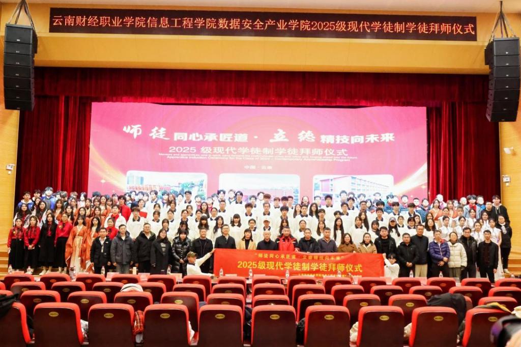 20251120日,云南财经职业学院信息工程学院2025级现代学徒拜师仪式在学校大礼堂隆重启幕。学校副校长尹湘萍,相关职能部门及二级学院负责人,18名企业与行业协会技术骨干、专家,携500余名师生代表齐聚,共同见证传统尊师美德与现代职教的深度交融。