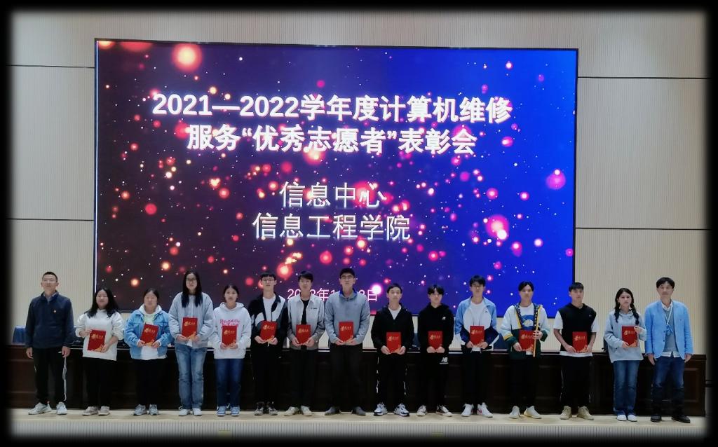 2022年11月4日,信息中心、信息工程学院在图书馆新报告厅举行了2021—2022学年度计算机维修服务“优秀志愿者”表彰会。会上表彰了王朝新等14名计算机维护志愿小队的优秀志愿者。计算机维护志愿小队自2021年成立以来,一直秉承义务为大家提供良好维护服务和营造良好的校园氛围的宗旨,旨在用自己的专业技能帮助更多人。