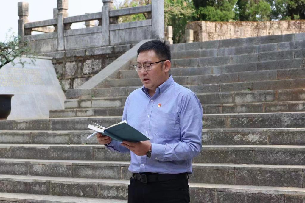 学工党支部书记杨帆同志讲述了王德三、王复生等革命烈士的英雄事迹,带领全体同志为烈士默哀,向烈士墓碑敬献鲜花,重温了入党誓词。