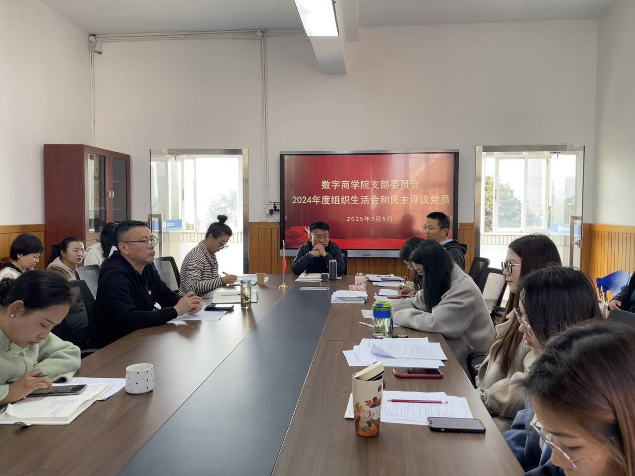 2025年3月5日,数字商学院党支部在修德楼408会议室召开2024年度组织生活会及民主评议党员大会,会议由党支部书记刘珍亿同志主持,支部12名正式党员及9名预备党员参会,学校党委委员、副校长李雄同志到场指导,学院民主党派以及新进教师代表列席了会议。