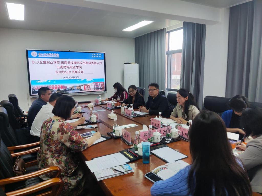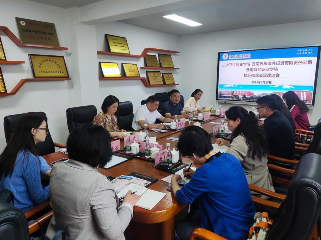 2025年6月25日,学校与长沙卫生职业学院、云南云投康养投资有限责任公司在知行楼4楼会议室进行校际校企交流座谈会。学校党委委员、纪委书记马加巍,数字康旅学院副院长方爱莲,以及数字康旅学院专业带头人、银龄教师等人员参会,方副院长主持会议。