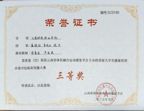 此次优异成绩充分展现了数字康旅学院学子扎实的专业素养、卓越的实践能力及良好的团队协作精神。学院将以此为契机,持续深化“以赛促学、以赛促教、以赛促改”的教育教学改革,不断提升人才培养质量,为云南省健康服务与管理事业贡献更多青春力量!