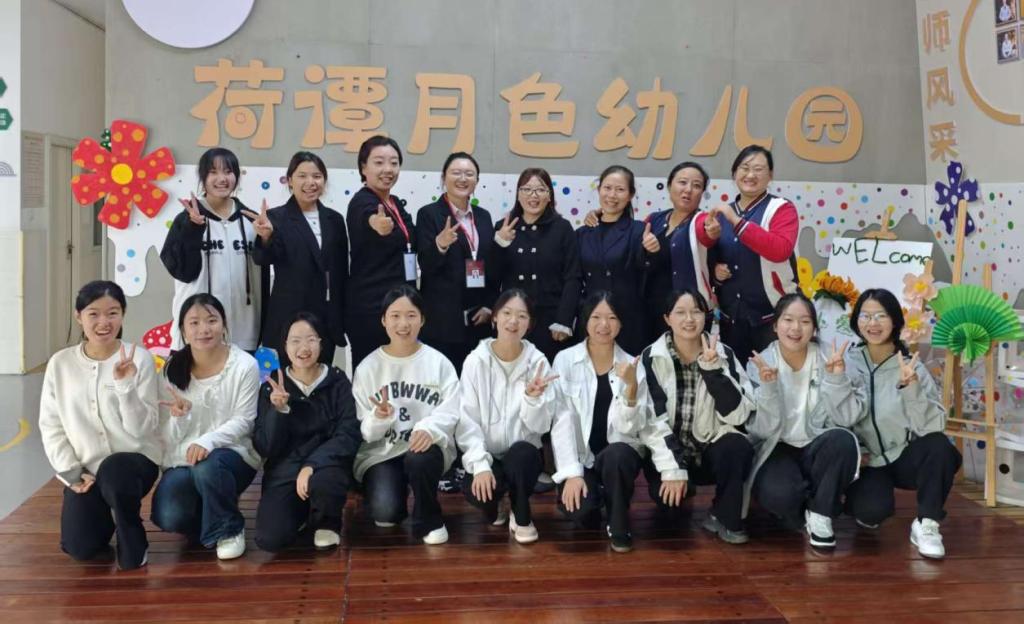 在实践课程开展过程中,荷潭月色幼儿园内经验丰富的资深教师与数字康旅学院负责校内实训的专业指导教师紧密合作,共同组建了“双师”团队。在整个实践期间,他们始终如影随形地对学生们的各项活动进行细致地跟踪观察,并给予无微不至地指导。