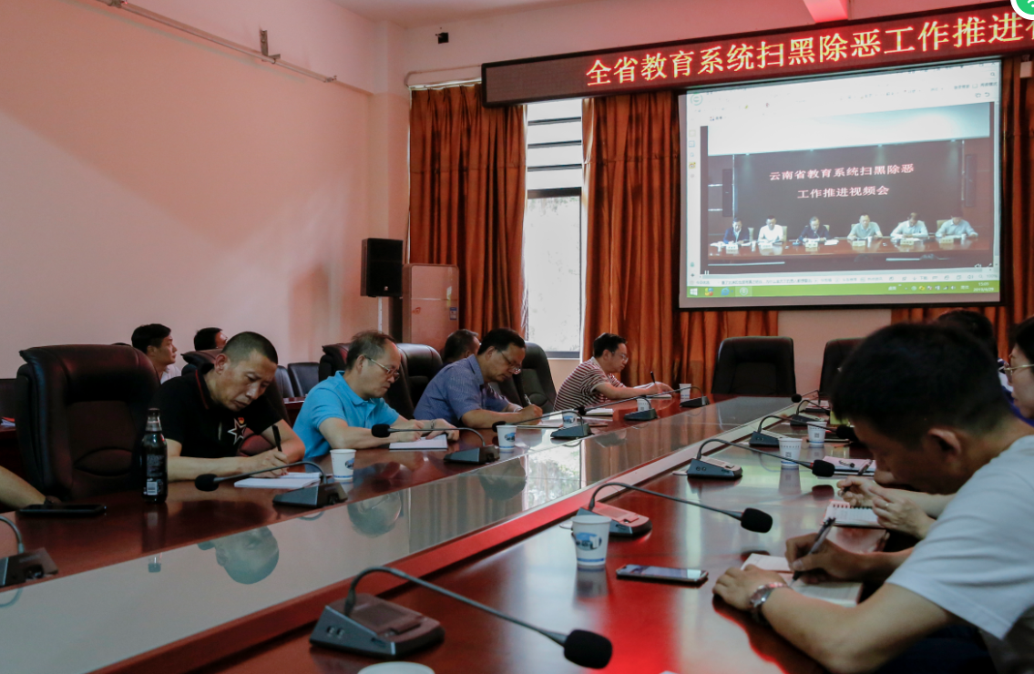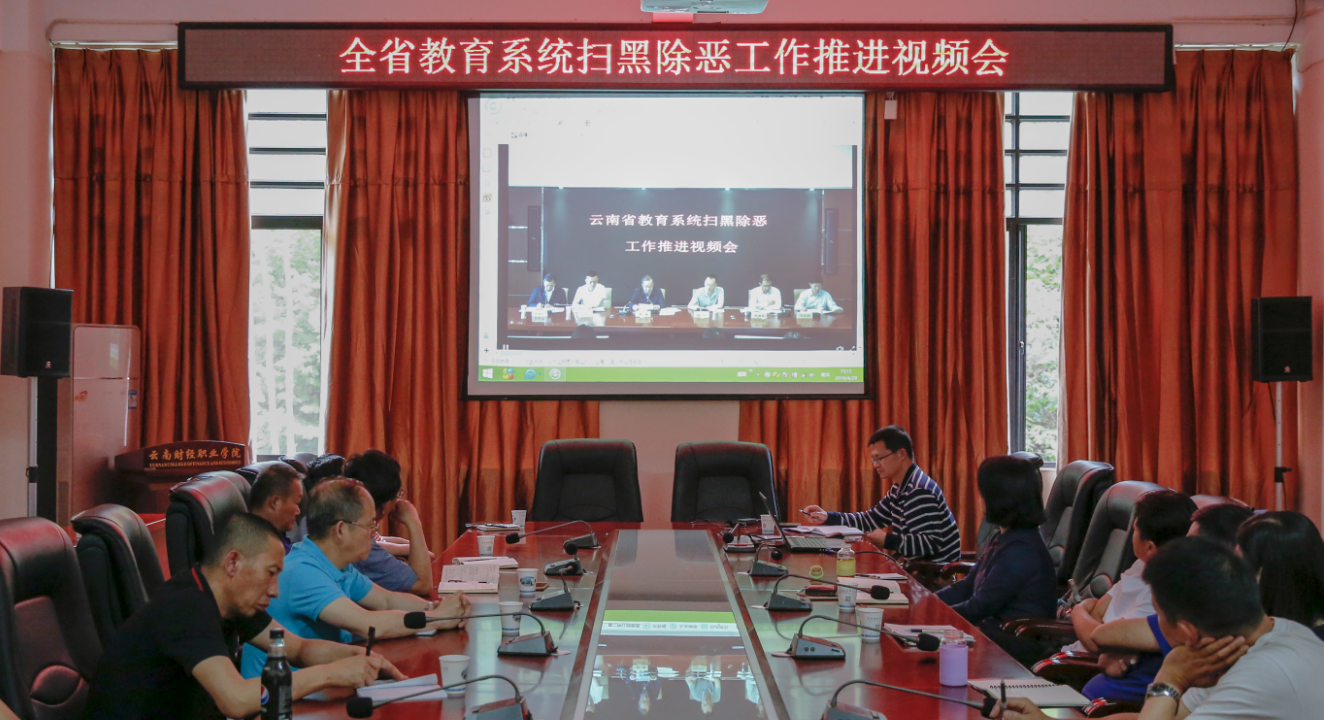 4月29日下午15:00,学校扫黑除恶专项斗争工作领导小组组长李思泽、陶昌学,副组长李树伟及部分中层干部在财苑楼三楼会议室收看全省教育系统扫黑除恶专项斗争工作推进视频会议,此次视频会议主会场设在省教育厅,全省各州市、县市区、省属各高等学校、中等职业学校、中小学幼儿园设立了249个分会场,会议由省教育厅副厅长、省教育系统扫黑除恶专项斗争工作领导小组副组长曾继贤主持。省委政法委政治部主任、省扫黑办副主任陈川,省公安厅刑侦总队副总队长邢豫明,省教育厅副厅长赵德荣,省招生考试院院长王永全以及省人力资源和社会保障厅、省市场监督管理局、省通信管理局、省金融办有关负责同志出席会议。