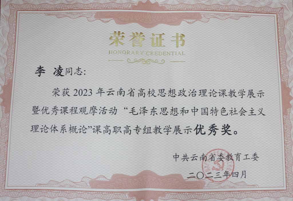 在今年3月举行的2023年云南省高校思想政治理论课教学展示暨优秀课程观摩活动中我校马克思主义学院思政课教师李凌、杨冉分别荣获毛泽东思想和中国特色社会主义理论体系概论课程(高职高专组)优秀奖和习近平新时代中国特色社会主义思想概论课程(高职高专组)三等奖,为学校争得了荣誉,展现了我校教师优良的精神风貌。