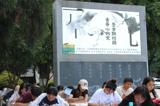 为深入学习贯彻习近平新时代中国特色社会主义思想,引导青年学生自觉践行社会主义核心价值观、弘扬中华优秀传统文化、传承书法艺术,坚持推进“五育”并举促进学生全面发展。2023年5月18日下午,我校会计学院、语言文字委员会及校团委于在立德楼门口举办了“青春心向党 墨香飘校园”校园书法比赛。