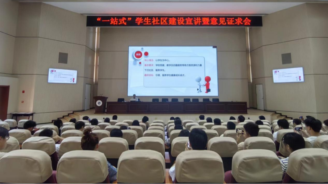 为进一步推动习近平新时代中国特色社会主义思想主题教育走深走实,优化“一站式”学生社区建设方案,突出社区党建引领、服务学生等功能,增加学生知晓率,学生工作部于2023年5月31日在学校报告厅组织召开“一站式”学生社区建设宣讲暨意见征求会,会议由学生工作部部长主持,全校校本部各班班长参加了本次会议。