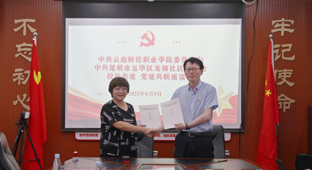 为深入开展学习贯彻习近平新时代中国特色社会主义思想主题教育,以学促干推动主题教育走深走实,深化党建工作内涵,积极推动学校与龙锦社区互联互动、共建共享工作。6月9日上午,学校特邀昆明市五华区龙锦社区党委书记石姝侠一行到学校举行校社共建、党建共联座谈会,商讨共建事宜、签订共建协议。