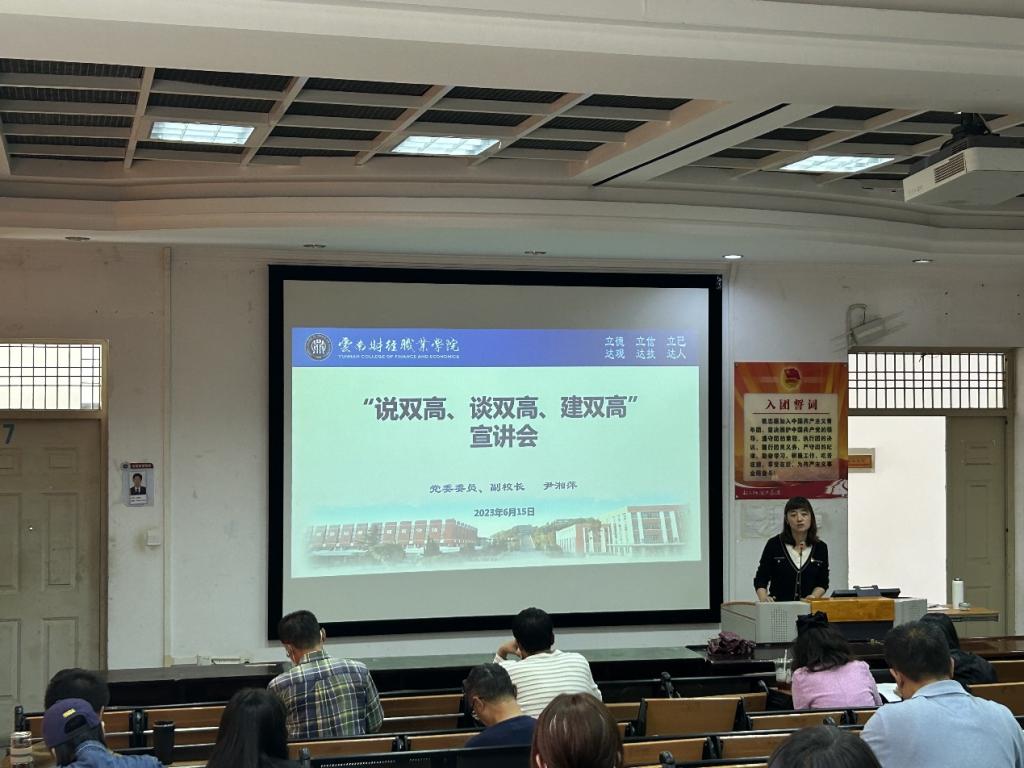 为全力推进“双高计划”项目建设,营造“人人知晓双高标准、人人参与双高建设、人人贡献双高成果”的浓厚氛围,2023年6月15日下午,学校“说双高、谈双高、建双高”——“双高计划”建设宣讲会的四个宣讲组同时开讲。本次宣讲活动主要面向二级院部专职教师及职能部门教职员工。学校党委副书记、校长邹丽,党委委员、副校长尹湘萍,教务处处长、“双高计划”办公室副主任,“双高计划”办公室工作人员分别担任宣讲人。