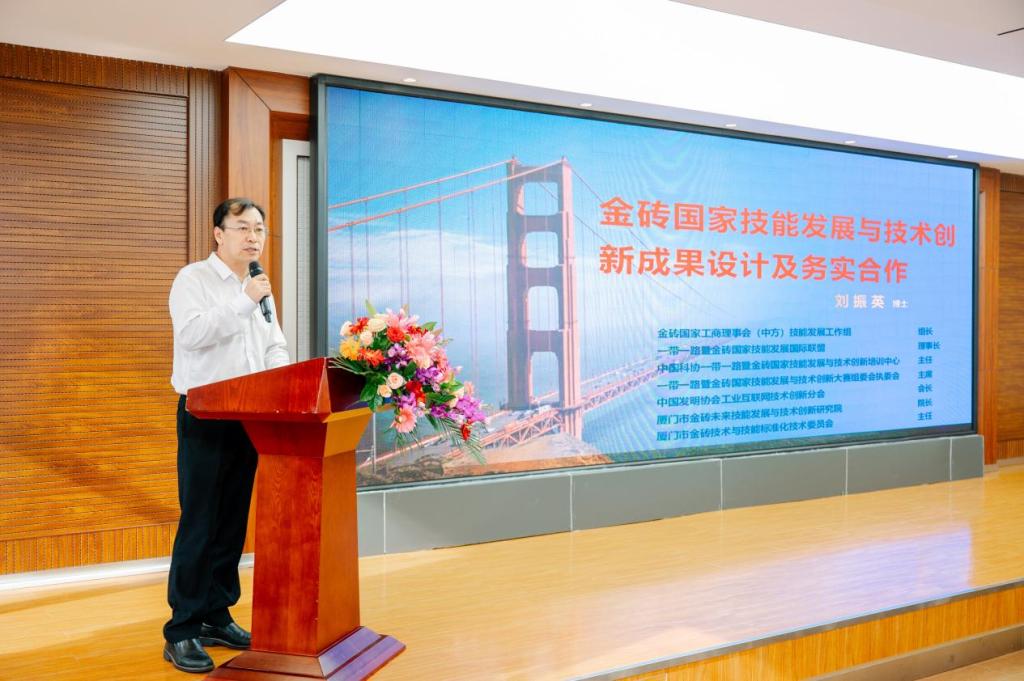 会上,金砖国家工商理事会(中方)技能发展工作组组长、一带一路暨金砖国家技能发展国际联盟理事长刘振英博士以《金砖国家技能发展与技术创新成果设计及务实合作》为题,向与会嘉宾详细介绍了金砖国家工商理事会技能发展工作组及成果设计、金砖技能标准开发工作委员会、金砖国家未来技能训练基地合作、金砖国家技能发展与技术创新系列大讲堂机制、金砖国家职业技能大赛、一带一路暨金砖国家技能发展联盟等方面的具体情况,也介绍了2023年南非金砖峰会周的活动安排。