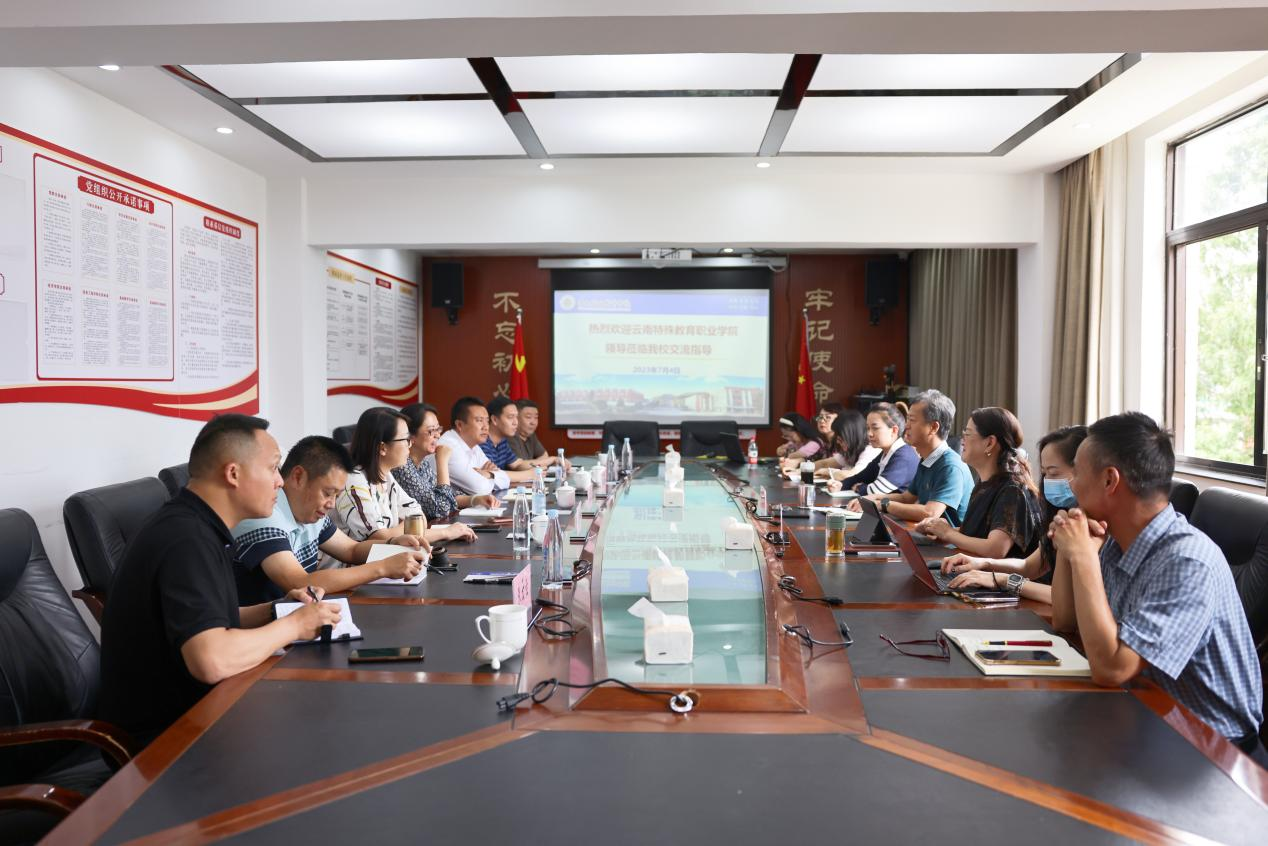 7月4日,云南特殊教育职业学院石安银副书记一行7人到我校考察交流。两校在行政楼第一会议室进行座谈交流。学校副校长沈豫琼出席座谈会,会议由党委副书记仲新主持。