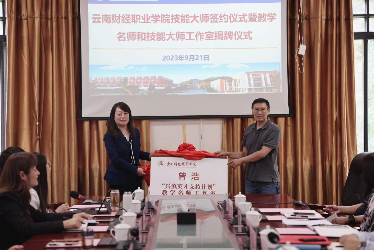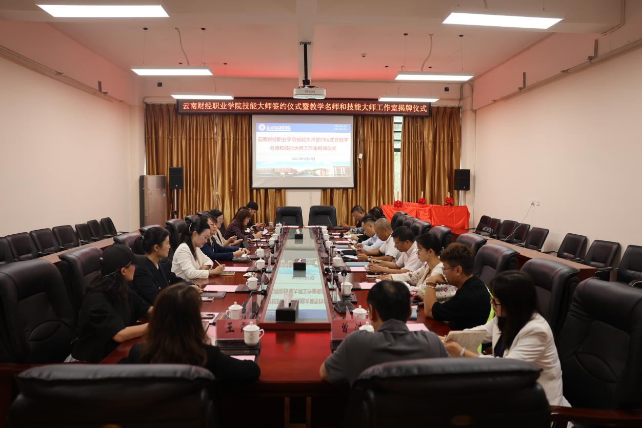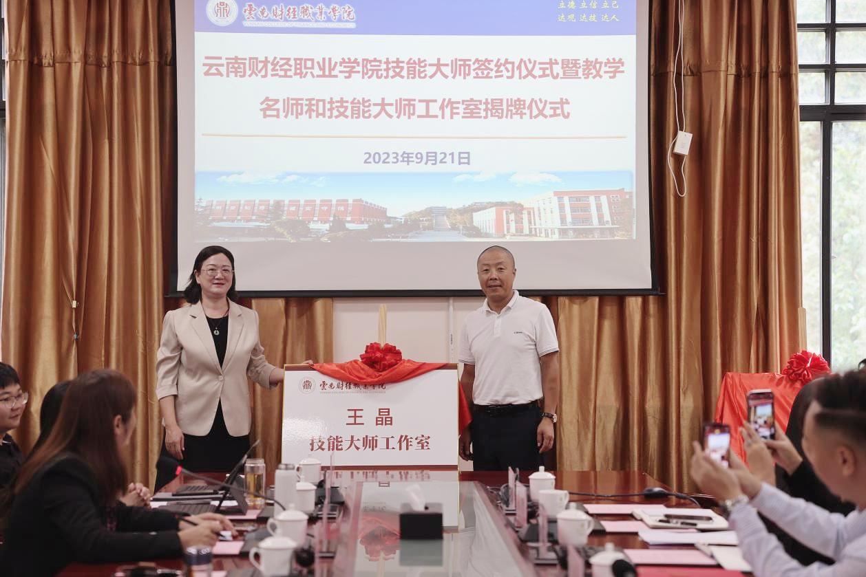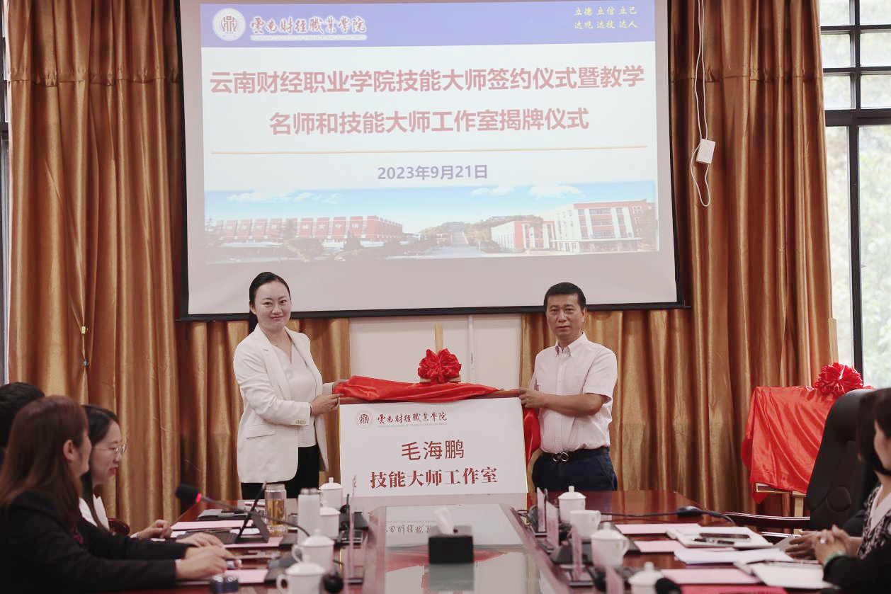 为深入贯彻中央及省委人才工作会议精神,落实《关于加强和改进新时代云南人才工作的实施意见》,实施“人才强校”战略,2023年9月21日,学校技能大师签约仪式暨教学名师和技能大师工作室揭牌仪式在财苑楼三楼会议室举行。学校党委副书记、校长邹丽,党委委员、副校长沈豫琼,副校长严黄一仪,景天企业集团董事长、云南省代理记账行业协会会长王晶,昆明仟磬文化传播有限公司董事长毛海鹏,出席揭牌仪式。签约暨揭牌仪式由党委委员、副校长尹湘萍主持。