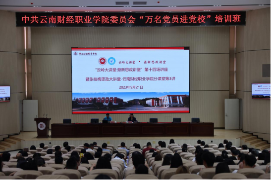 2023年9月21日云南财经职业学院举行张桂梅思政大讲堂-云南财经职业学院分课堂第三讲暨“云岭大讲堂·鼎新思政讲堂”第十四场讲座。学校特别邀请云南农业大学杨建荣副教授讲授“歌声飘过100年--中国共产党百年歌声中的红色记忆及启示”专题讲座,学校党委副书记、校长邹丽主持活动。