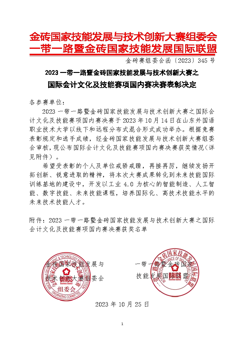2023一带一路暨金砖国家技能发展与技术创新大赛之国际会计文化及技能赛项国内赛决赛于2023年10月14日在山东外国语职业技术大学以线下和远程分布式混合形式成功举办。李冠群老师带领5支团队参加比赛,省赛阶段5支团队获一等奖1个,二等奖2个,三等奖2个。获得一等奖的团队锐意进取,不断精进专业技能,最终成功打入决赛并获得国内赛优胜奖。