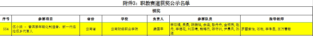 根据教育部司局函件《关于公示中国国际大学生创新大赛(2023)获奖名单及信息核对的通知》,我校参赛项目《佤小妹——普洱茶年轻化制造者,新一代临沧佤乡代言人》获得国赛职教赛道铜奖。