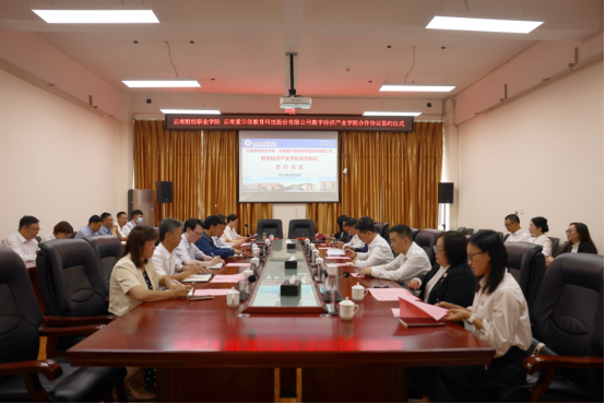 6月30日上午,我校与云南爱尔信教育科技股份有限公司(以下简称“云南爱尔信”公司)成功举行了数字经济产业学院合作协议签约仪式。云南省财政厅科教文化处处长李保春,学校党委书记张金甫,党委副书记、校长邹丽,“云南爱尔信”公司董事长毛良,公司执行总裁余强出席签约仪式,学校党委副书记仲新、各职能部门和二级学院负责人、“云南爱尔信”公司副总裁毛建友、产业学院副院长俞岚等参加会议。校党委委员、副校长尹湘萍,“云南爱尔信”公司产业学院副院长段明聪代表双方签约。校党委委员、副校长沈豫琼主持。