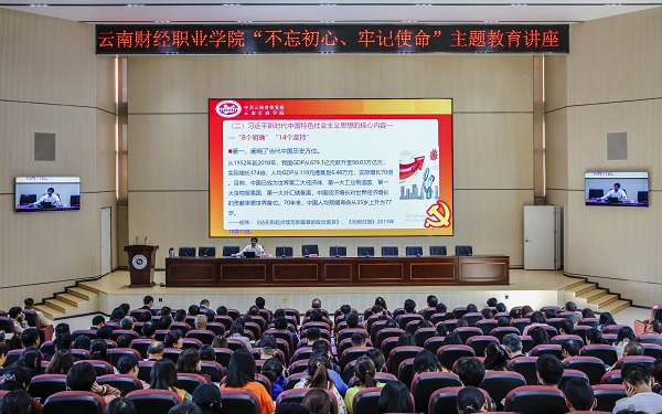 为认真贯彻落实中央《关于开展第二批“不忘初心、牢记使命”主题教育的指导意见》和我省实施意见精神,进一步增强基层党员的学习教育实效,更好地推动习近平新时代中国特色社会主义思想深入人心、落地生根,10月18日下午,省委宣讲团成员、省委党校副校长、云南行政学院副院长马金书教授应邀作“不忘初心、牢记使命”主题教育暨“万名党员进党校”宣讲报告会,学校领导、中层干部、全体党员教职工和入党积极分子培训班学员聆听了报告会,报告会由学校党委书记李思泽同志主持。