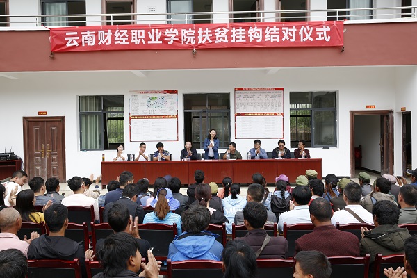 30号早上,扶贫走访工作队到达普乐村村委会。在村委会会议室,举行中共云南财经职业学院委员会与中共普乐村总支委员会“双联系一共建双推进”的签约仪式。学院党委委员、院长助理彭锋泽同志代表学院签约。随后,在普乐村村委会小广场举行云南财经职业学院扶贫挂钩结对仪式。云南财经职业学院纪委书记杨红英同志、康普乡副乡长杨鸿翔同志、学院党委委员、院长助理彭锋泽同志、普乐村扶贫工作队长杨继光同志,学院党委委员、院长助理、学院驻岔枝村工作队队长刘宁飞同志,普乐村村委会主任余文新同志和学院挂钩帮扶的家庭代表及学院扶贫走访工作队的同志们参加了扶贫挂钩结对仪式。在结对仪式上杨红英同志代表学院作了讲话。在讲话中杨红英同志简要介绍了学校的情况,代表学院党委和班子成员及全体教职工向挂钩帮扶的家庭表示诚挚的慰问,向关心支持学院驻村队员工作、生活的乡、村领导表示感谢,向坚守在扶贫一线的同志们致以崇高的敬意。在大会上郑炯惠老师就四美创建作了宣讲。