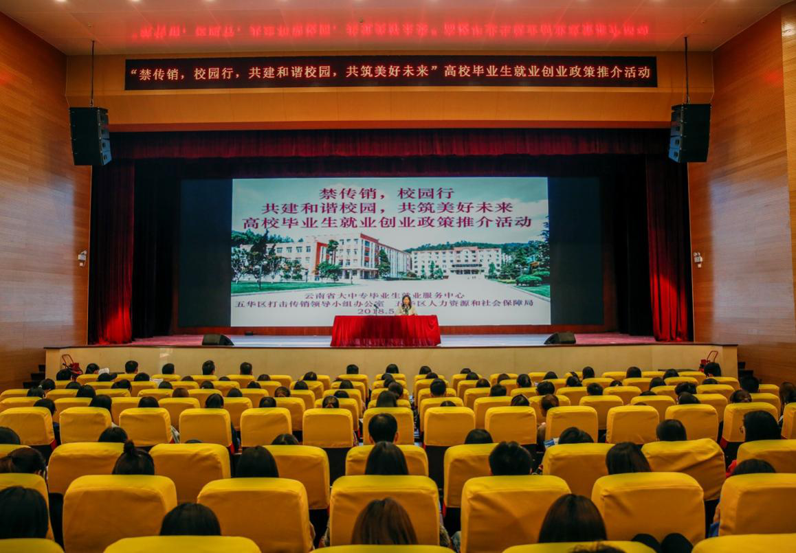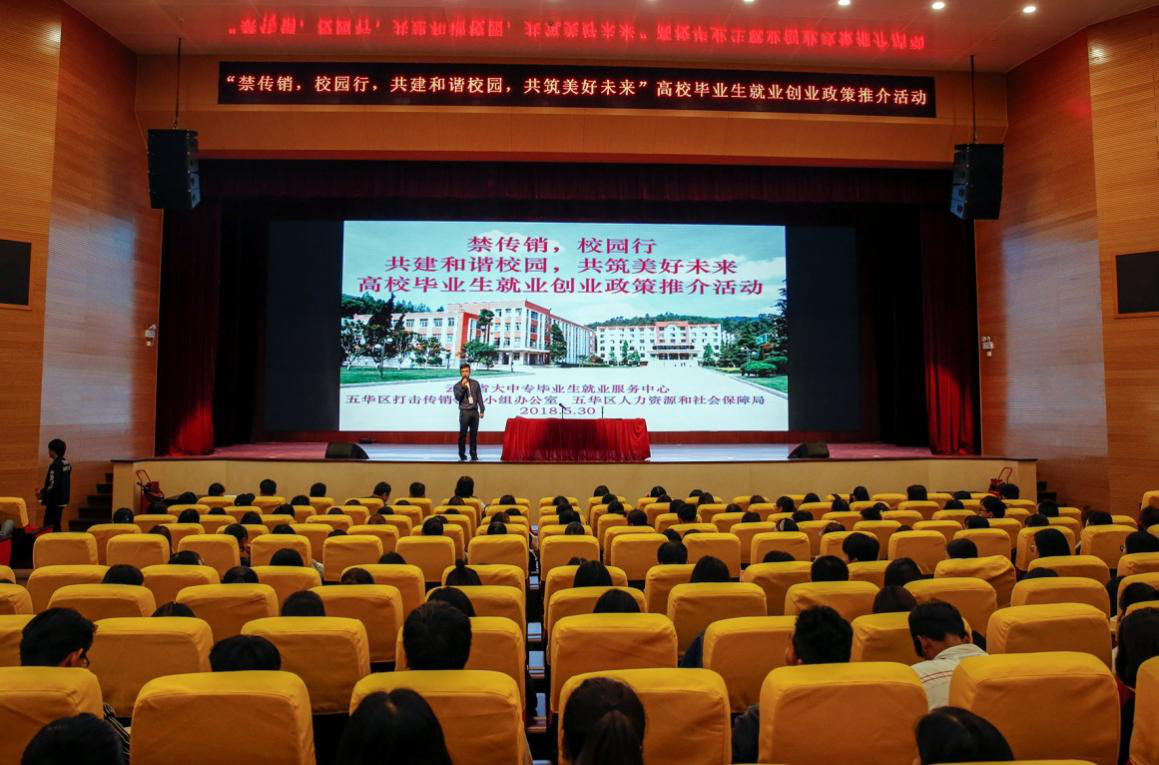 2018年5月30日上午,由五华区打击传销工作领导小组办公室携手五华区人力资源和社会保障局组织开展的“禁传销 校园行 共建和谐校园 共筑美好未来” 高校毕业生就业创业推介活动在我校举行,云南省大中专毕业生就业服务中心、五华区打击传销工作领导小组办公室、五华区人力资源和社会保障局、五华区劳动就业服务局相关领导、学院院长助理彭锋泽同志以及相关部门负责人出席了活动。
