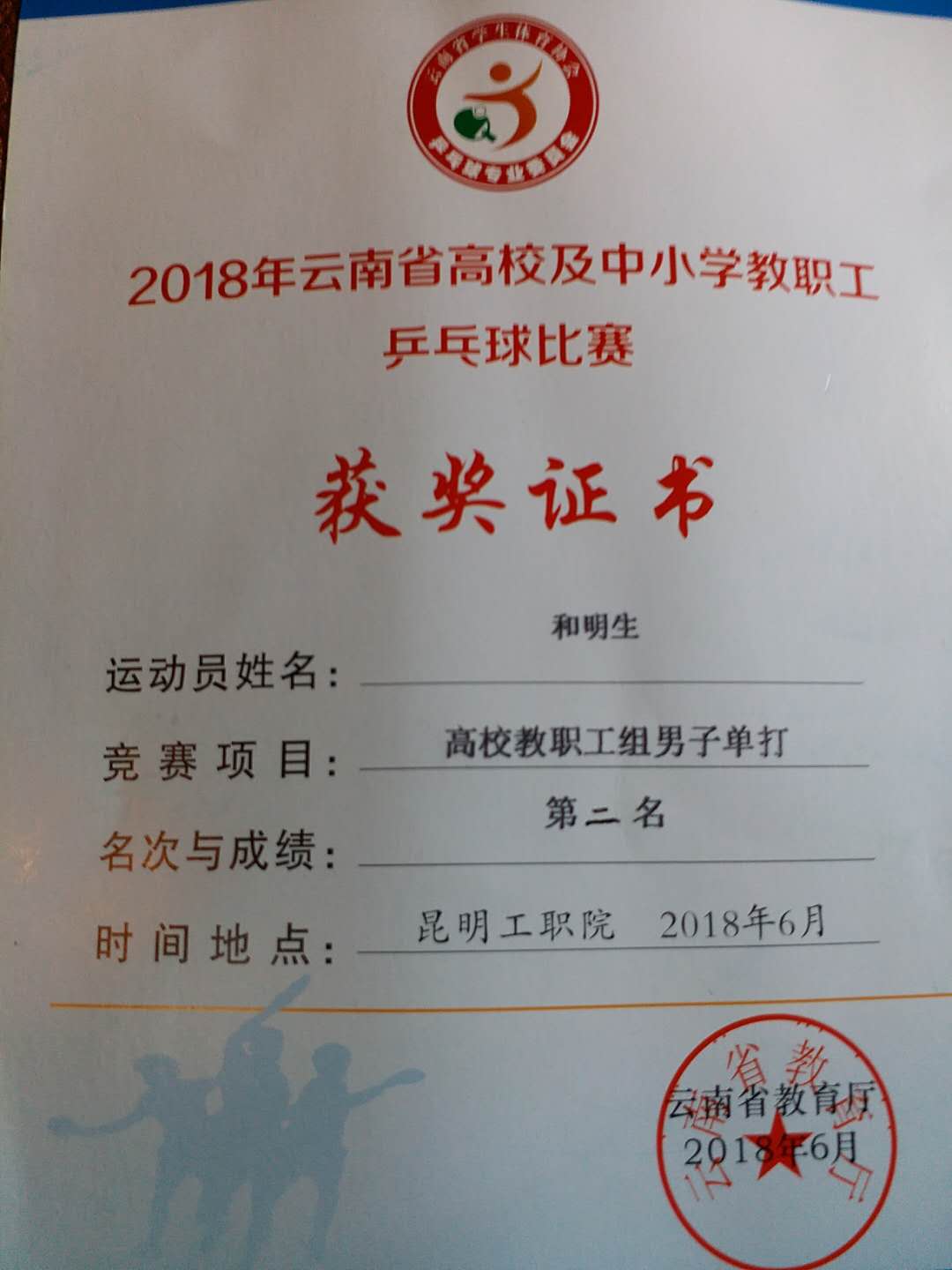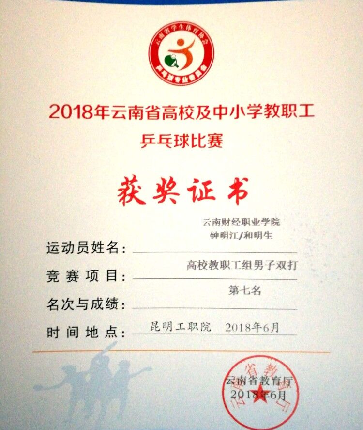 根据“云南省教育厅关于举办2018年云南省高校及中小学教职工乒乓球比赛的通知”的通知精神,本着“参与、交流、宣传”的原则, 6月19至24日,学院工会组织了由和明生、钟明江、代拥军等3名教工组成的代表队,参加了在昆明工业职业技术学院举办的“2018年云南省高校及中小学教职工乒乓球比赛”。