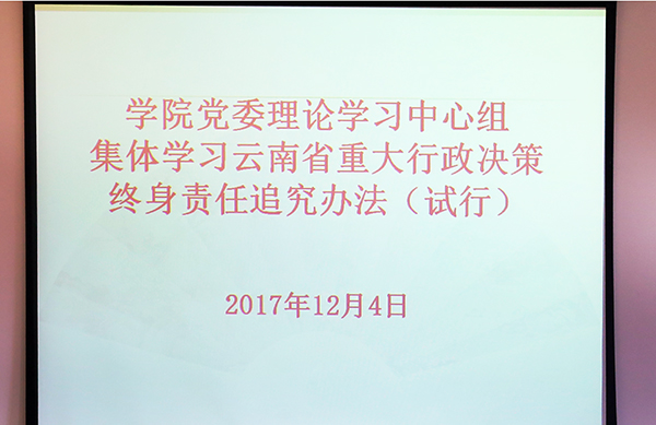 会上,陶昌学院长传达学习了由云南省人民政府印发的《云南省重大行政决策终身责任追究办法(试行)》的通知要求;纪委书记杨红英同志领学了中国共产党第十九次全国代表大会关于《中国共产党章程(修正案)》的决议;院长助理彭锋泽同志领学了《中国共产党章程》的部分章节,并组织集体学习了《习近平谈治国理政》(第二卷)一书。