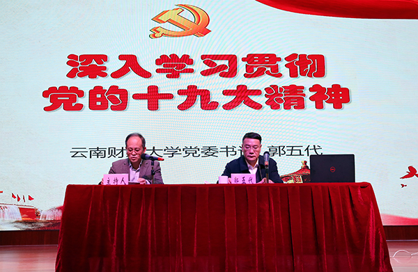 2017年12月12日下午,云南省教育系统宣讲团成员、云南财经大学党委书记郭五代为我校师生作党的十九大精神宣讲报告,学校领导、党员和师生共700余人参加了报告会。报告会由我校党委书记李思泽同志主持。