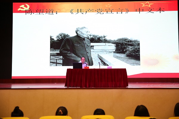 随后,李思泽书记以《共产党宣言》中文本翻译者陈望道老先生一生坚定信仰,身体力行诠释“信仰的味道是甜的、信仰的力量是伟大的”真谛的故事引出了本次讲座的主题:中国共产党的性质、宗旨、奋斗目标。