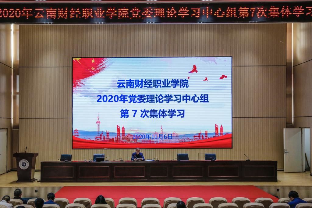 11月6日上午,学校在报告厅举行2020年党委理论学习中心组第7次集体学习,本次集体学习的主题是学习党的十九届五中全会精神及《中华人民共和国民法典》。学习由党委书记李思泽同志主持,党委副书记、校长陶昌学同志,党委副书记仲新同志,党委委员、纪委书记杨红英同志,党委委员、副校长李树伟、沈豫琼、刘宁飞同志,党委委员、组织部部长张国庆同志,党委委员、宣传部部长陈君奇同志,中层管理干部和基层党组织支委参加学习。