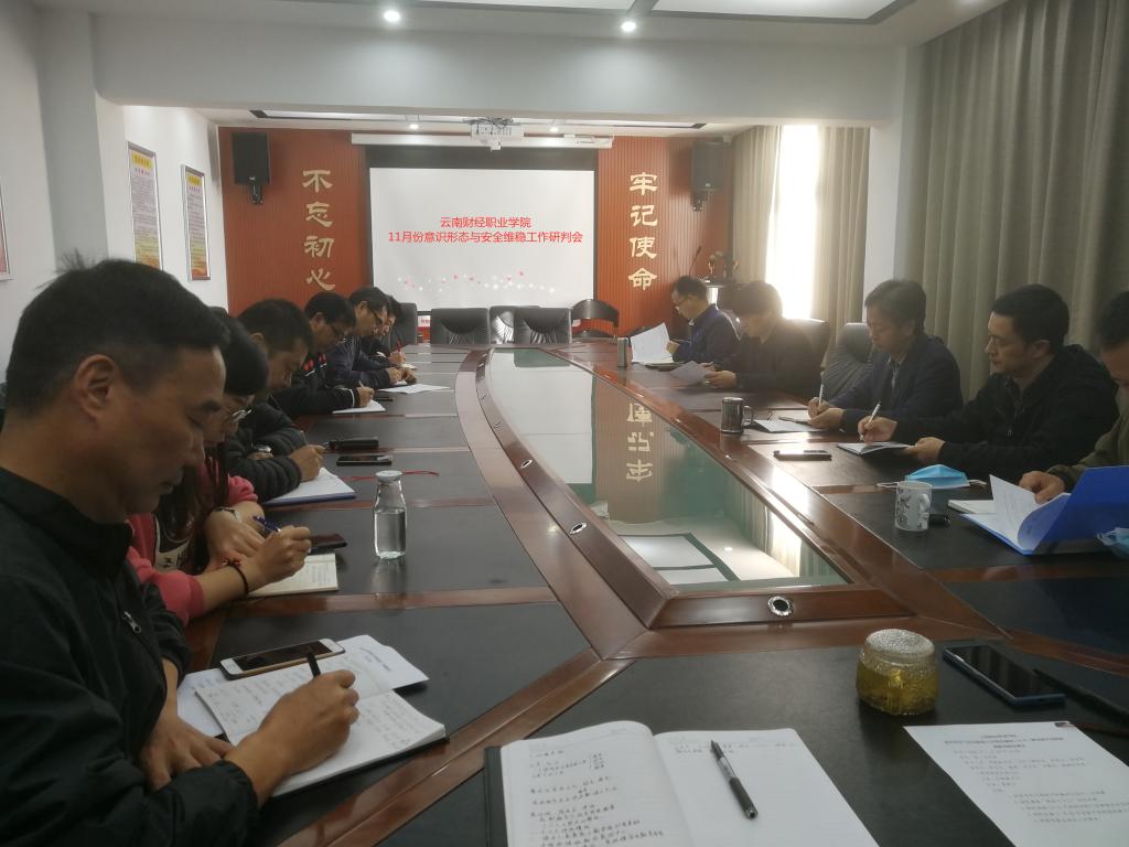2020年11月26日上午,学院召开月度意识形态与安全维稳工作研判会,党委副书记仲新同志主持。党委委员、副院长刘宁飞同志,办公室、宣传统战部、纪检处、学生处、团委、保卫处、后勤服务中心、基建办、思政部、基础教学部负责人及各二级学院党支部书记参加会议。
