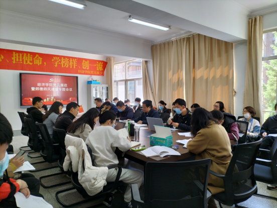 会议开始,由经济学院院长王兆远汇报经济学院成立两年来的改革发展情况以及2022年春季学期的重点工作;支部书记周跃对经济学院2021年党风廉政和师德师风建设工作落实情况进行总结并对2022年工作进行部署。