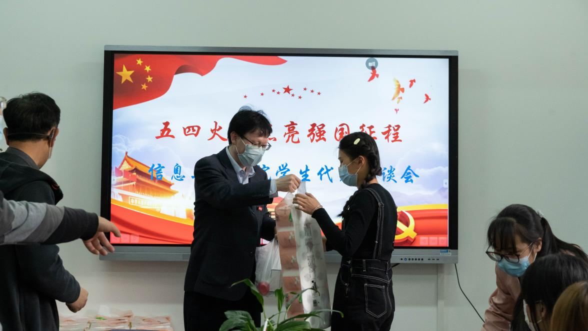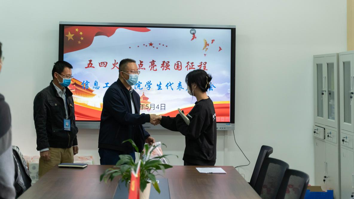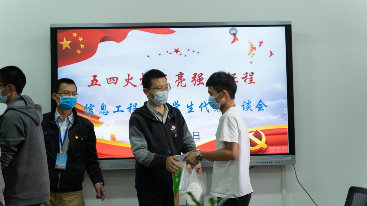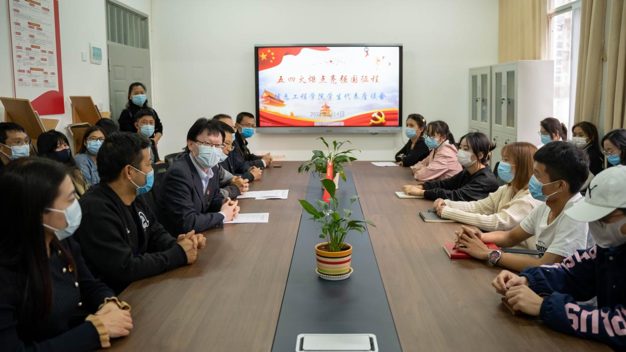 走访学生宿舍后,在信息工程学院党建活动室进行了“五四火炬点亮强国征程”——信息工程学院学生代表座谈会。党委书记张金甫同志出席会议,信息工程学院党支部书记刘珍亿主持,三个支部的党员以及30名信息工程学院学生代表。