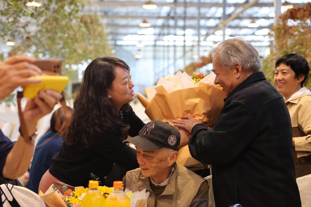 校领导和关工委成员单位负责人给到会的80岁以上的老同志献花,感谢他们为学校发展所做的贡献,祝愿他们身体健康,生活幸福。
