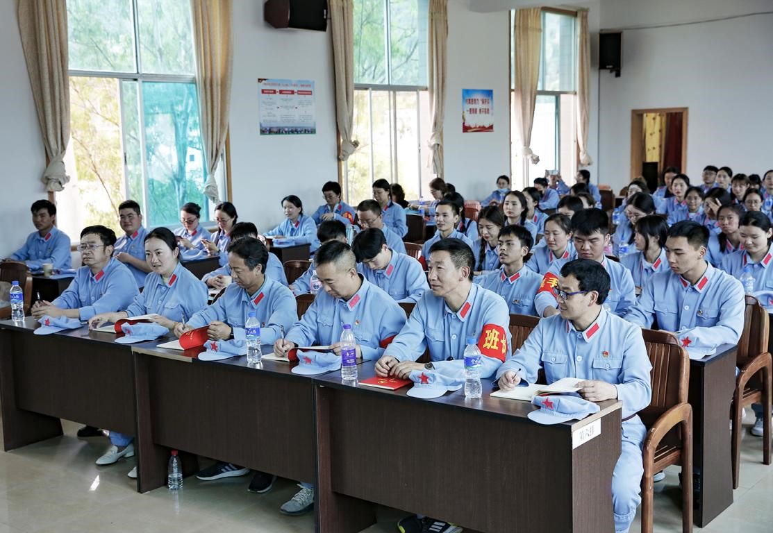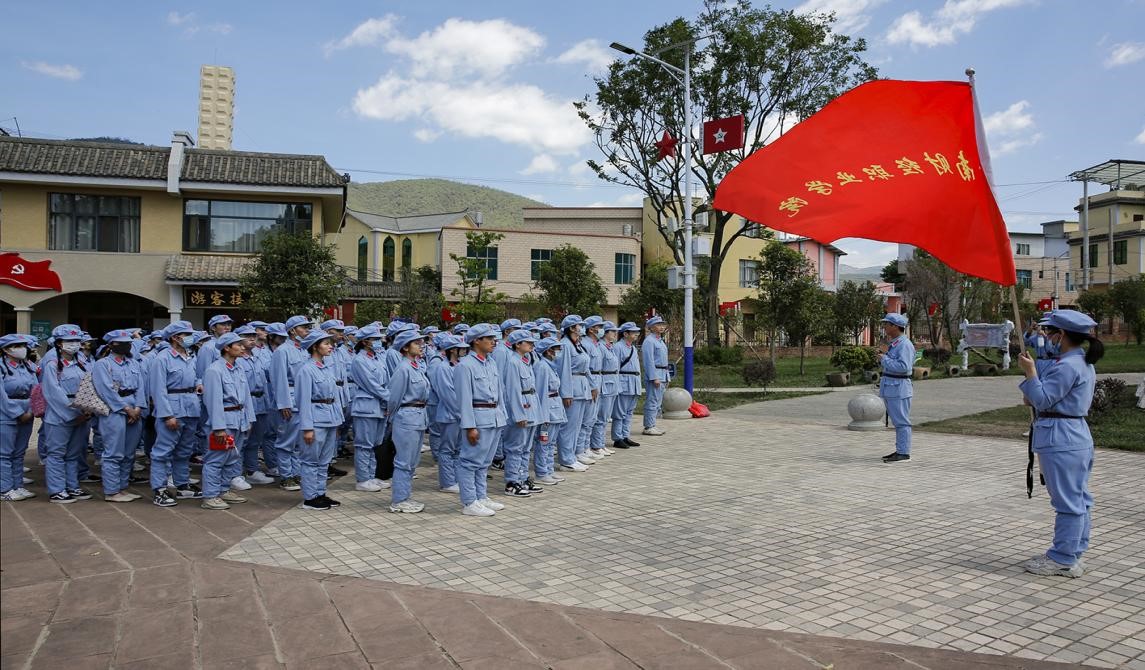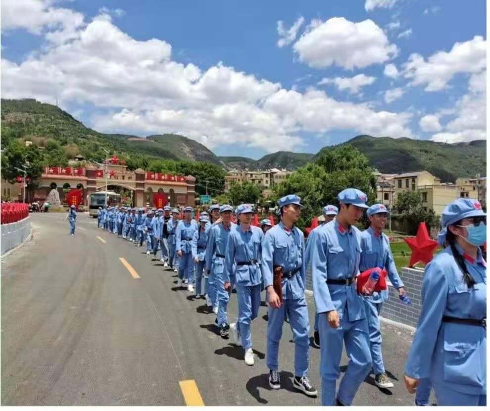 在去寻甸柯渡的大巴车上,带队老师带领大家朗读毛泽东的《七律·长征》,齐声歌唱《没有共产党就没有新中国》。到达红军长征柯渡纪念馆后,师生们换上了红军装,戴上了红军帽,整齐列队听学校党委副书记仲新同志做动员讲话,正式开启了红色学习之旅。