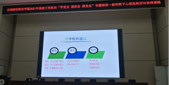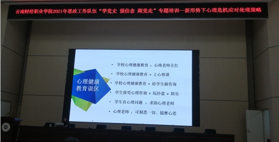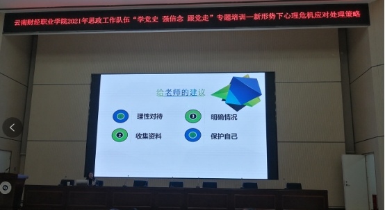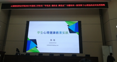 为加强大学生心理健康教育工作,提高学生工作队伍工作能力,掌握解决心理健康问题的手段和方法,提高学生工作队伍人员自身心理健康水平,2021年10月25日下午,会计学院全体专兼职辅导员参加了由学校举办的2021年心理健康教育专题培训。云南师范大学附属世纪金源中学高级教师陈航给大家带来讲座《新形势下心理危机应对处理策略》。