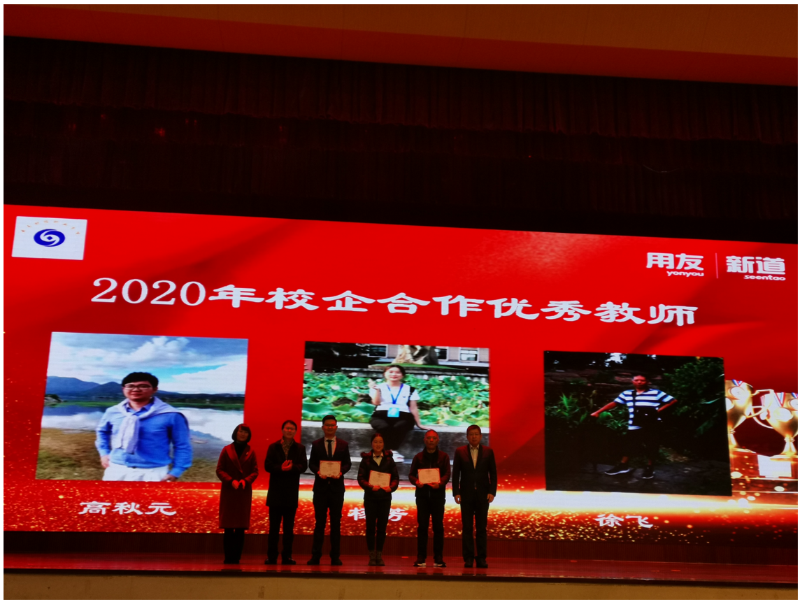 在学生代表的发言结束后,主持人郑重介绍了获得2020年云财务会计师优秀教师的高秋元老师、杨芳老师、徐飞老师三位老师,分别为同学们详细介绍了每一位老师身上的闪光点。校党委书记张金甫老师、新道公司副总裁刘曙光先生为新道优秀教师颁发2020年校企合作优秀教师荣誉证书,并表达祝贺,众人合影留念。