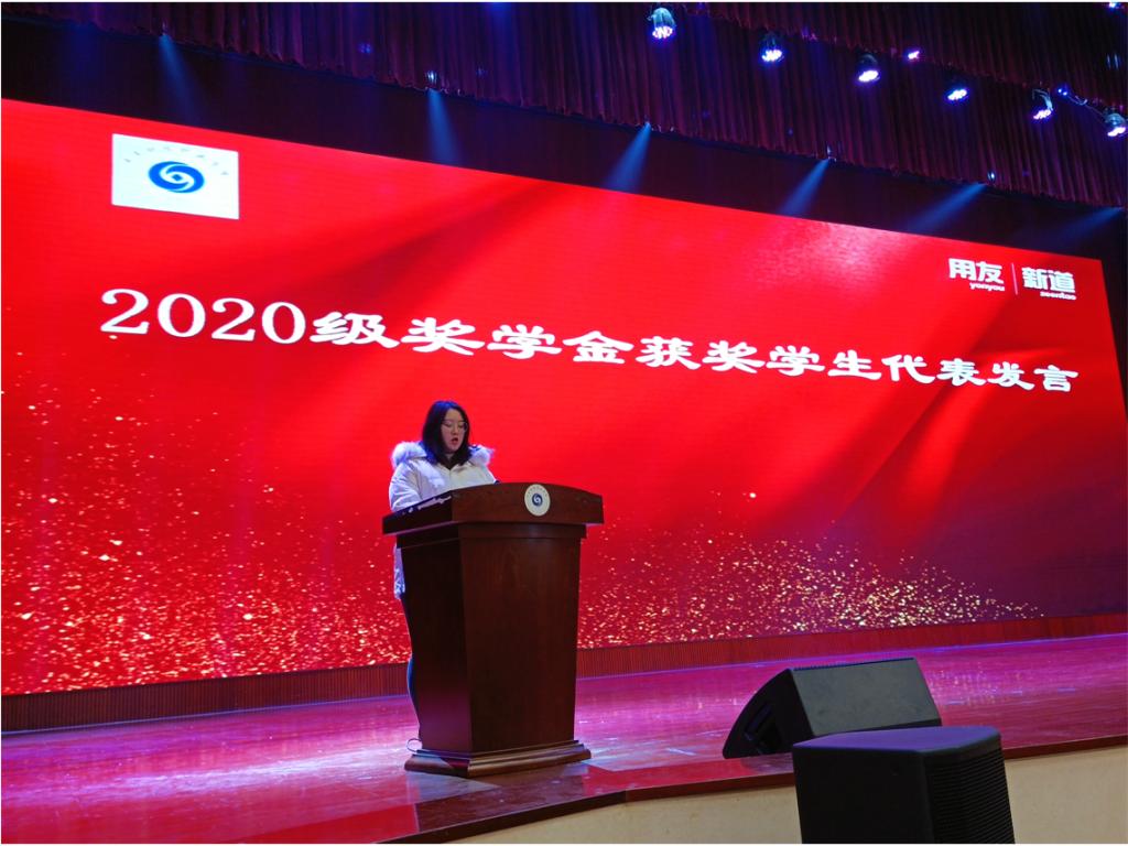 在颁奖结束后,2020级云财务会计师2班获得奖学金的田红宇同学作为优秀学生代表发言。回顾了2020级云财务班同学在校一年的学习历程,在这一年的学习中每一位云财务班的同学都得到了很大的提升,整个班级的成绩在同级班级的排名中名列前茅,同时,云财务班也是一个团结友爱,多才多艺的班级,积极参与学校各项活动,起到了表率的作用。并且感谢了每一位为云财务班默默付出的老师与后勤人员,是他们在背后帮助云财务班同学不断前进,取得成绩。在未来,2020级云财务会计师班的同学们也将继续前进,努力学习,不辜负学校和企业期望,努力成为一名符合国家、企业要求的高素质的复合型会计人才。