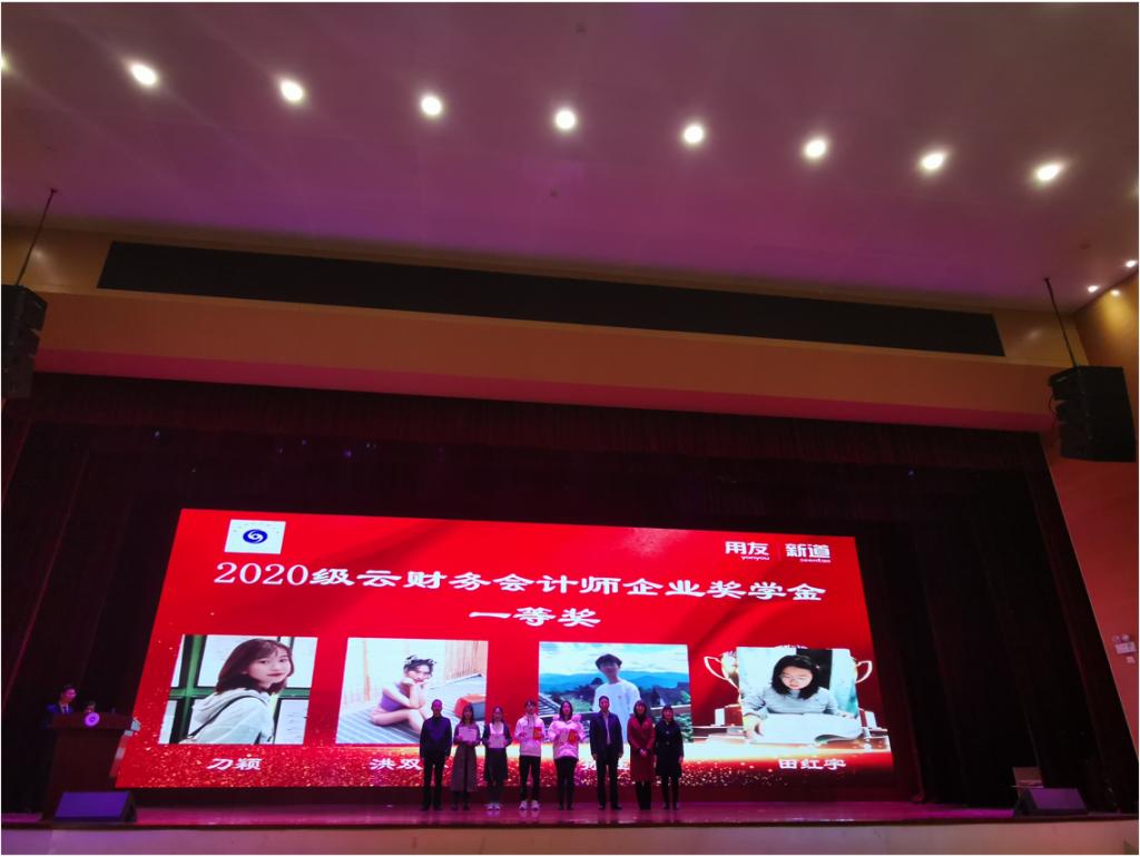 之后,主持人宣布颁发新道一等、二等、三等奖学金,并请获得奖学金的122020级云财务会计师班的同学们分别上台领奖,刘曙光先生、杨华女士、陈斌书记、尹湘萍院长为他们颁发奖学金和荣誉证书。