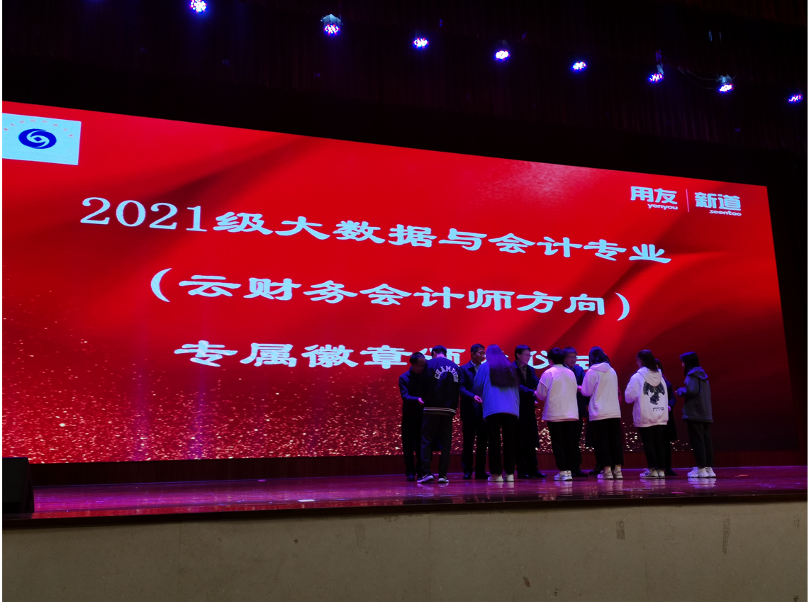 在校企双方领导、老师和同学们的共同见证下,校企双方在前期良好合作的基础上,校领导和嘉宾分别向2021级云财务大数据与会计师会计1班、2班的班主任授予班旗。随后,与会领导为云财务会计师班的同学们共同授予“云财务会计师”专属徽章,并进行合影留念,共同记录下这一意义深远的时刻。