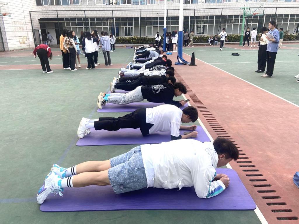 同学们依次进行了男女生平板支撑男生俯卧撑、女生的仰卧起坐集体跳大绳等四个项目。训练过程中,同学们挥洒汗水,咬紧牙关,没有一人选择放弃。中途休息间隙,同学们有说有笑,气氛轻松活跃,身心都得到了放松。在同学们的身上看到了新一代青年坚忍不拔顽强拼搏、敢于担当的精神