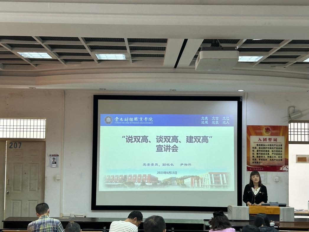 为调动全校力量,集中优势资源,营造“人人知晓双高标准、人人参与双高建设、人人享受双高成果”的浓厚氛围,2023年6月15日下午,学院在育德楼205室集中开展了“双高计划”建设工作宣讲活动,学校党委委员、副校长尹湘萍应邀作宣讲,信息工程学院、公共课教学部(体育部)、办公室、纪检处、人事处等五个部门的全体教职工聆听了宣讲会。